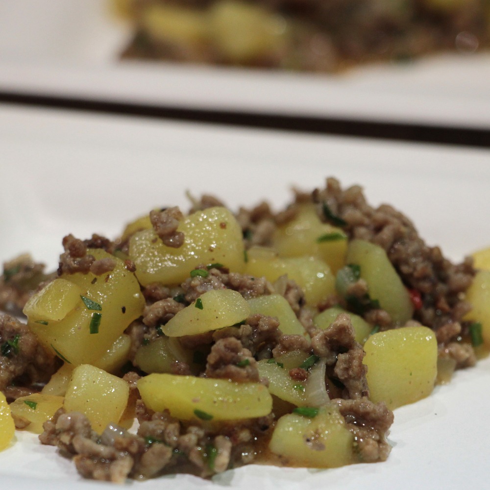 Das Hackfleisch in der Pfanne anbraten und mit Salz, Pfeffer und der Gewürzmischung würzen. Nach Ablauf der Garzeit die Kartoffeln noch heiß in die warme Marinade geben und einziehen lassen.