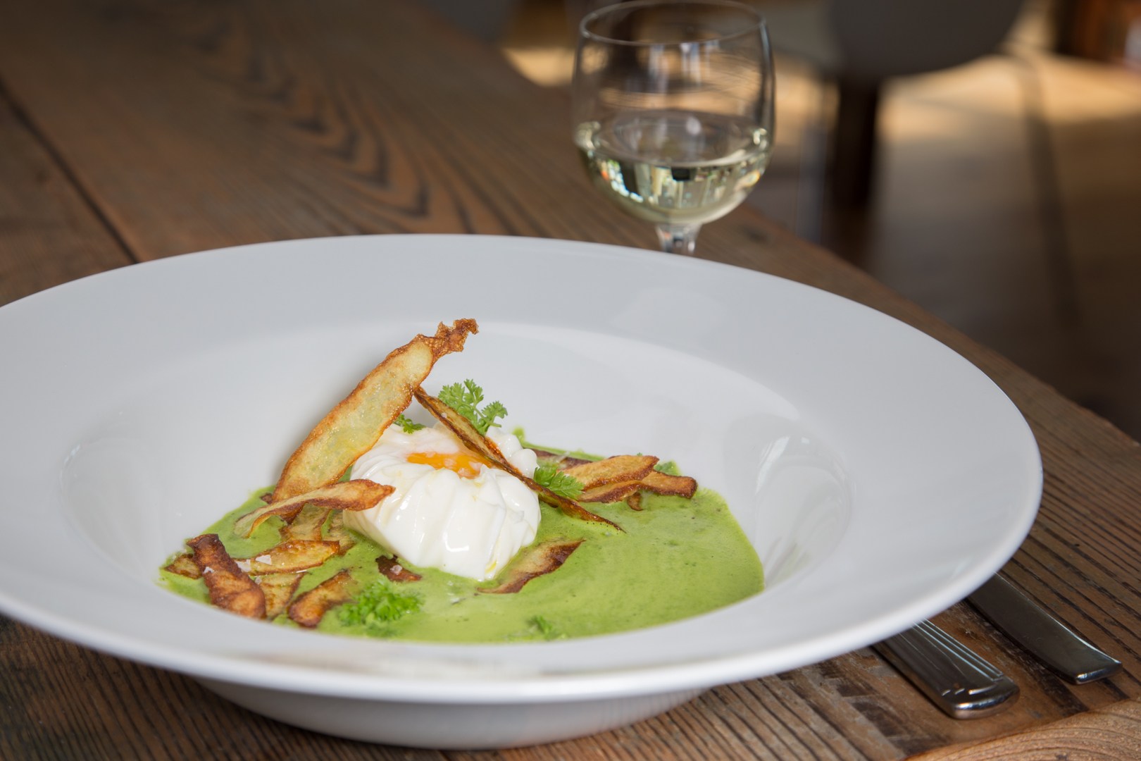 Kerbel-Spinatschaum mit Onsenei und Kartoffelknusper