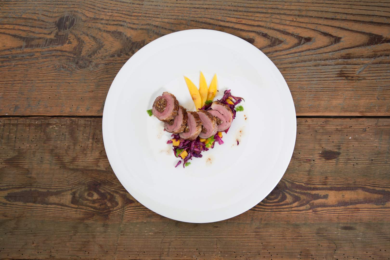 Fleisch aus dem Backofen nehmen, Garn entfernen und in Scheiben schneiden. Roulade mit Rotkohlsalat auf einem großen Teller anrichten. Mit frischer Petersilie dekorieren.